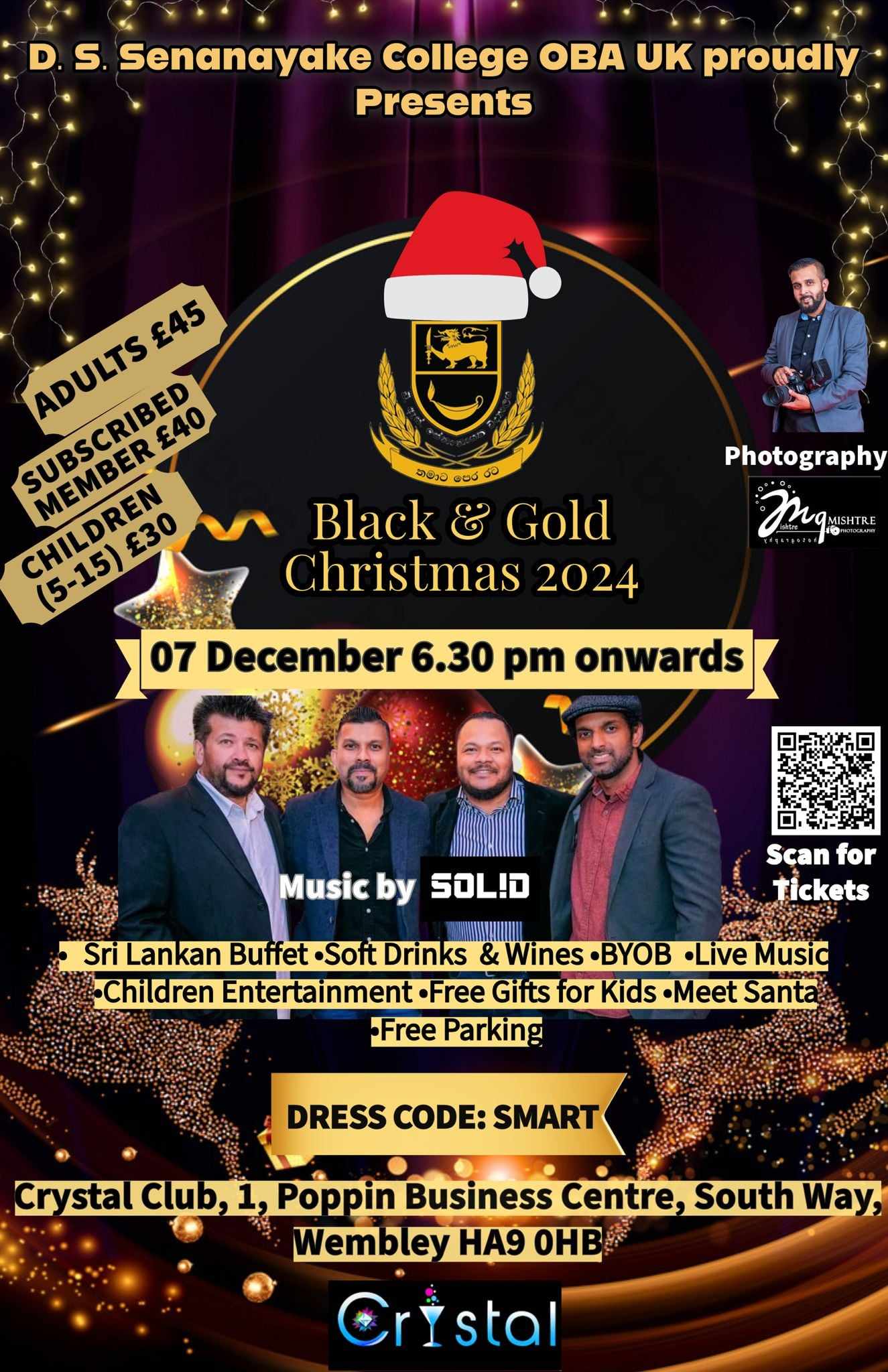 The most awaited event on the DSSC OBA UK calendar. The Christmas Party “Black & Gold Christmas 2024” will be held on 07 December 2024 at the Crystal Club, Wembley, London. We invite all our DSSC OBA UK members, families and friends to attend this special event. SOLiD music band will be entertaining you throughout the evening. Mishtre photography will be capturing all the special moments of the event.